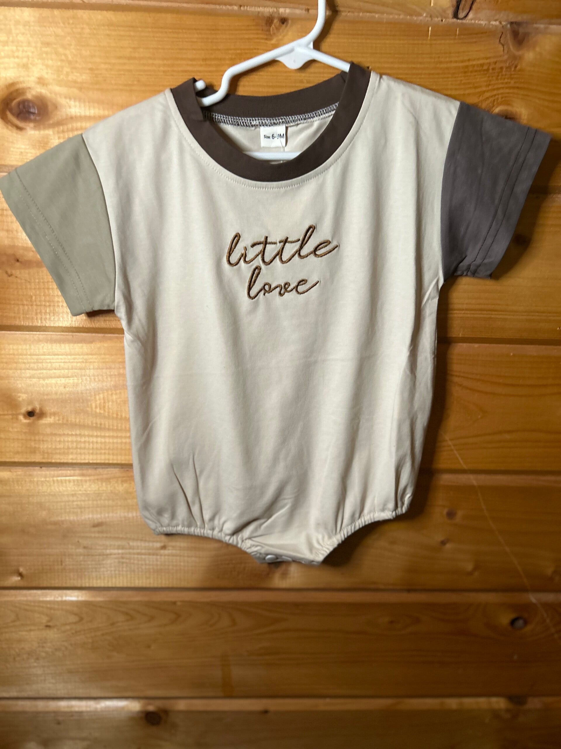 Adorable neutral baby romper featuring soft color-block sleeves and embroidered “little love” detail. Lightweight, comfy fit with snap closure for easy changes. Perfect for everyday wear or a sweet photo outfit.