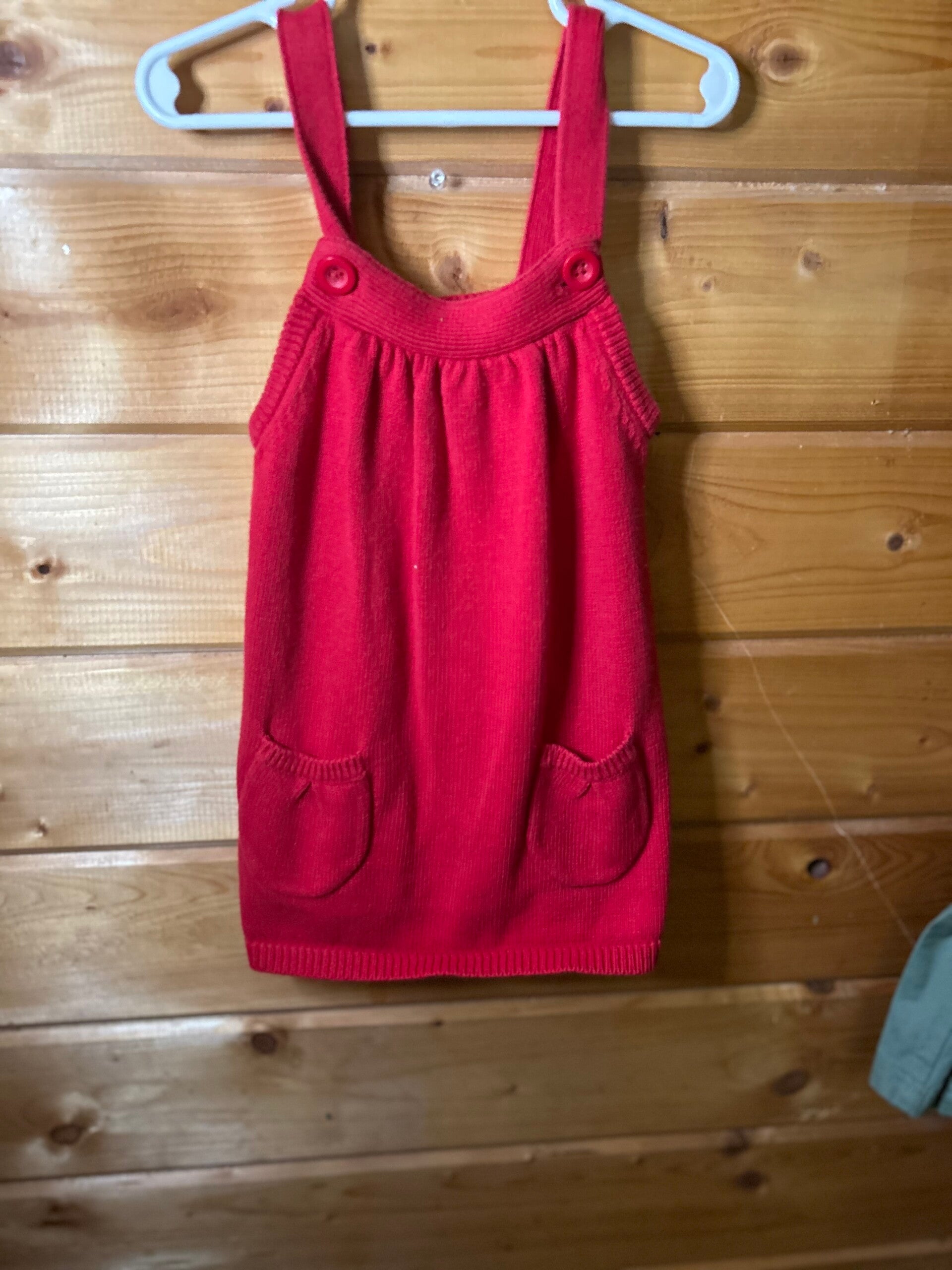 The Gymboree Overall Dress in red is a sleeveless, knee-length outfit designed for girls in size 5. Made from 100% cotton knit fabric, this dress features a square neckline, button closure, and a charming button pocket detail. Perfect for casual occasions in the fall and winter seasons, this dress is both stylish and comfortable for little girls on the go.